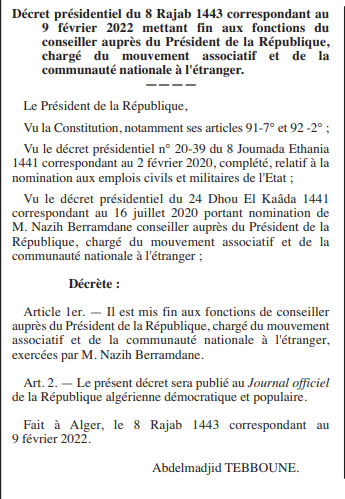 “Il est mis fin aux fonctions de conseiller auprès du Président de la République, chargé du mouvement associatif et de la communauté nationale a l’étranger, exercées par M. Nazih Berramdane”, a stipulé l’article 1 du décret présidentiel du 9 février 2022.