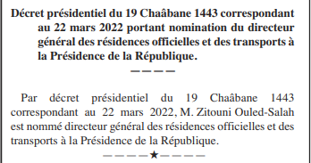 “Par décret présidentiel du 22 mars 2022, M. Zitouni Ouled-Salah est nommé directeur général des résidences officielles et des transports a la Présidence de la République”, a indiqué le JO.