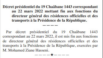 “Par décret présidentiel du 22 mars 2022, il est mis fin aux fonctions de directeur général des résidences officielles et des transports a la Présidence de la République, exercées par M. Mohamed Ziane Hasseni”, peut-on lire dans le 21e numéro du Journal Officiel (JO).