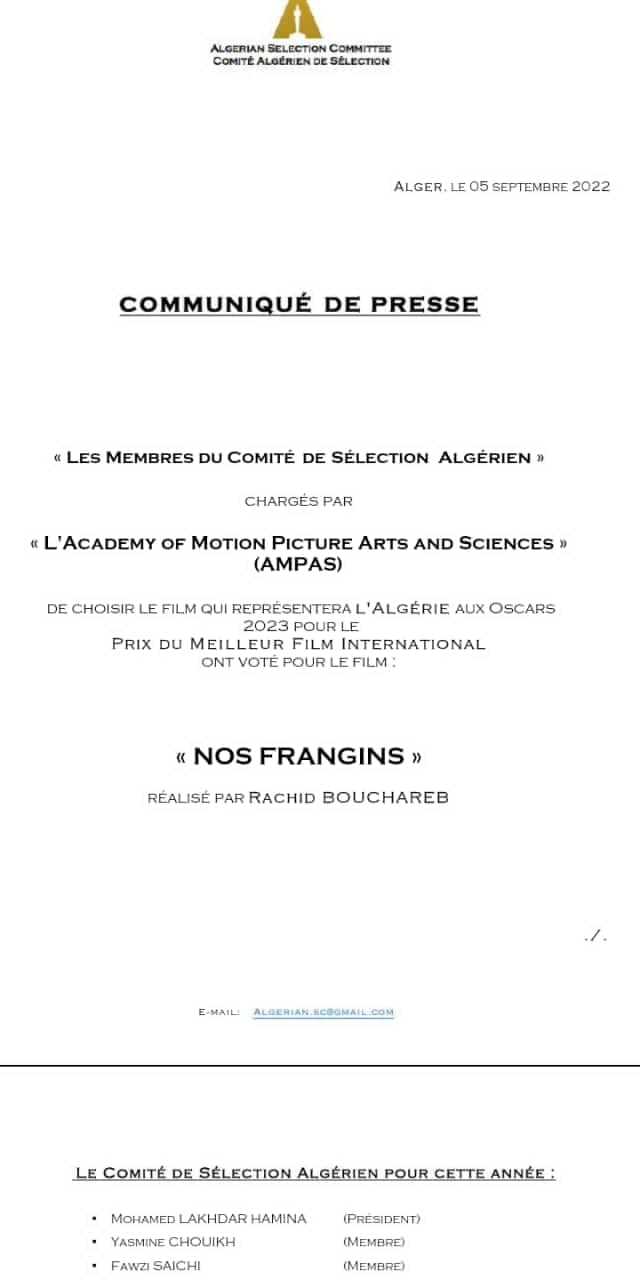“Les membres de Comité de sélection algérien chargés par l’Academy of Motion Picture Arts and Sciences (AMPAS) de choisir le film qui représentera l’Algérie aux Oscars 2023 pour le meilleur film international ont voté pour le film ‘Nos Frangins’ réalisé par Rachid Bouchareb”, a indiqué le comité dans un communiqué.