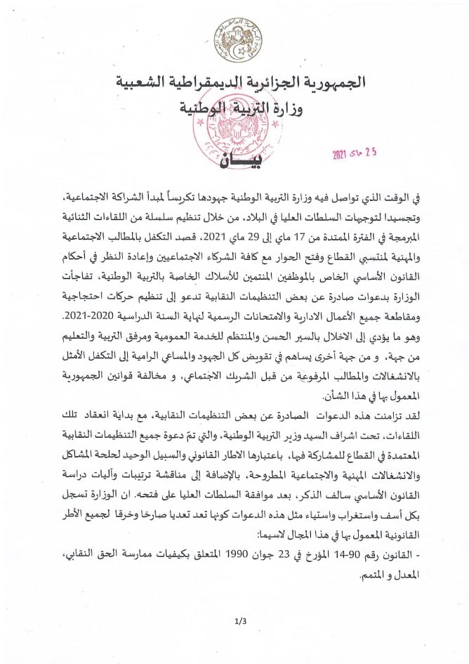 Le ministère a souligné dans un communiqué avoir été surpris par les appels lancés par certains organisations syndicales pour un mouvement de contestation et le boycott des opérations administratives ainsi que des examens officiels.