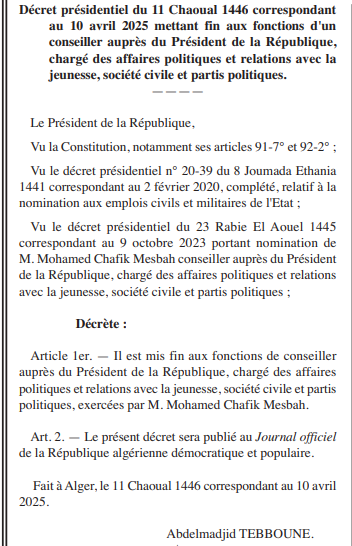 « Il est mis fin aux fonctions de conseiller auprès du président de la République, chargé des affaires politiques et relation avec la jeunesse, société civile et partis politiques, exercées par Mohamed Chafik Mesbah », peut-on lire dans le décret présidentiel du 10 avril 2025 paru dans le dernier numéro du Journal officiel (JO).