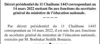 “Il est mis fin aux fonctions de secrétaire général du ministère de l’éducation nationale, exercées par M. Boubakar Seddik Bouazza”, peut-on lire dans le décrit présidentiel du 14 mars 2022 paru dans le 18e numéro du Journal Officiel.