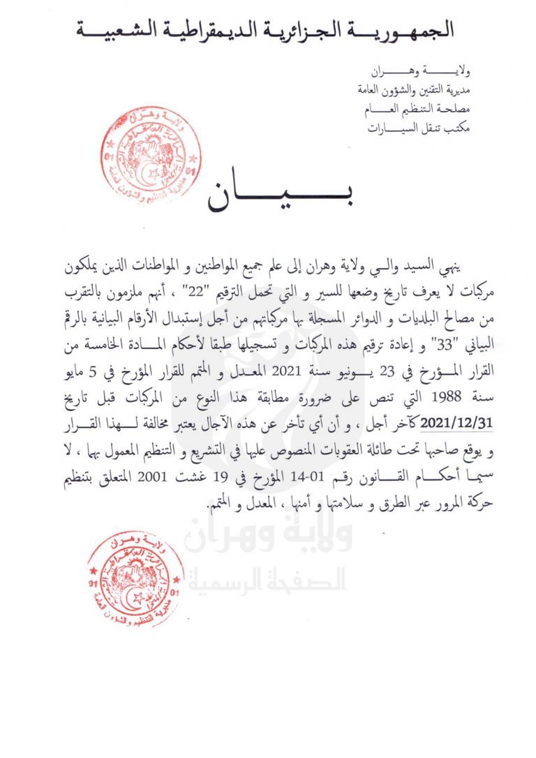 A cet effet, la direction de la réglementation et affaires générales (DRAG) de plusieurs wilayas ont expliqué qu’il sera procéder au changement du numéro d’immatriculation “22” attribué a ce type de véhicules par le numéro “33”.