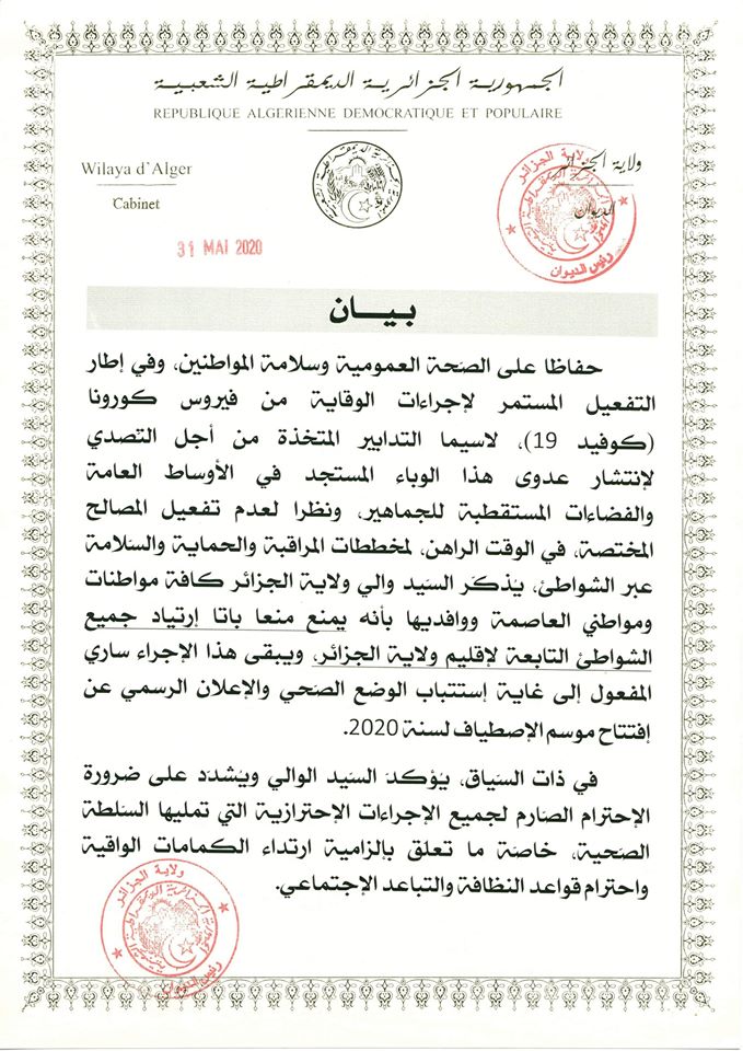 Le wali d’Alger a décidé dimanche 31 mai 2020 de fermer toutes les plages de la capitale dans le cadre de la lutte contre le nouveau coronavirus (Covid-19).