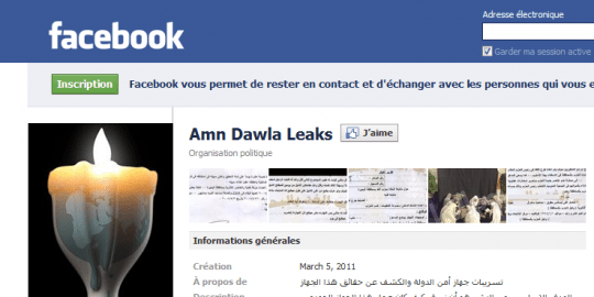La page s’appelle Amn Dawla Leaks (fuites de la sécurité de l’Etat), qui déploie de multiples preuves de la surveillance de l’Etat  mise en place par le régime de Hosni Mobarak en Egypte : des mots de passes de comptes Facebook ou Skype des  citoyens egyptiens,des rapports de surveillances de la minorité chrétiennes du pays, ou encore des photographies de cellules suspectées d’avoir été utilisées pour torturer des opposants et des islamistes. Ces documents ont été saisis par des manifestants qui se sont introduits de force, samedi dernier, dans les locaux du ministère de la sécurité intérieure, et qui les ont publiés sur Facebook.