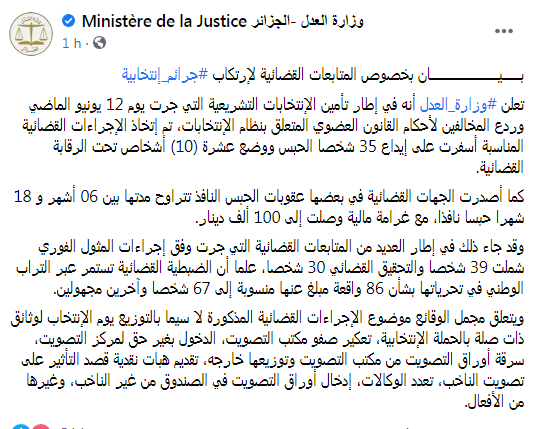 «Dans le cadre des efforts visant a assurer la régularité des élections législatives du 12 juin, des mesures judiciaires ont été prises a l’encontre des contrevenants aux dispositions de la loi organique portant régime électoral, donnant lieu au placement de trente-cinq (35) personnes sous mandat de dépôt et de dix (10) autres sous contrôle judiciaire», a précisé le ministère de la Justice dans un communiqué.