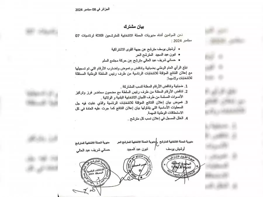 «Nous soussignées, directions de campagne des trois candidats à la présidentielle du 7 septembre 2024, Aouchiche Youcef, candidat du Front des forces socialistes (FFS), Tebboune Abdelmadjid, candidat indépendant, et Hassani Cherif Abdelaali, candidat du Mouvement de la société pour la paix (MSP), informons l’opinion publique nationale que des imprécisions, des contradictions, des ambiguïtés et des incohérences ont été relevées dans les chiffres lors de l’annonce des résultats provisoires de l’élection présidentielle par le président de l’Autorité nationale indépendante des élections», lit-on dans le communiqué.