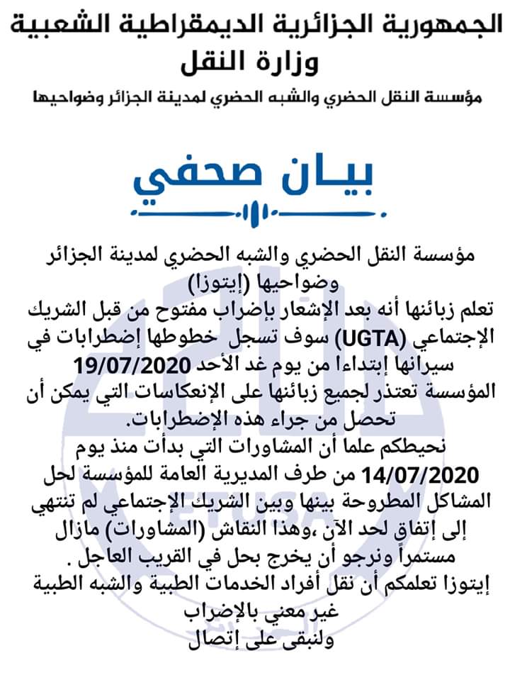 Les employés de l’Entreprise de transport urbain et suburbain d’Alger « Etusa » ont déclenché ,ce dimanche 19 juillet 2020, une grève illimitée.
