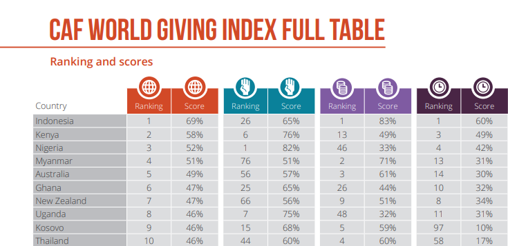 Le classement est établi suivant trois critères, a savoir le pourcentage d’habitants qui ont donné de l’argent a une organisation, donné de leur temps ou aidé un inconnu.