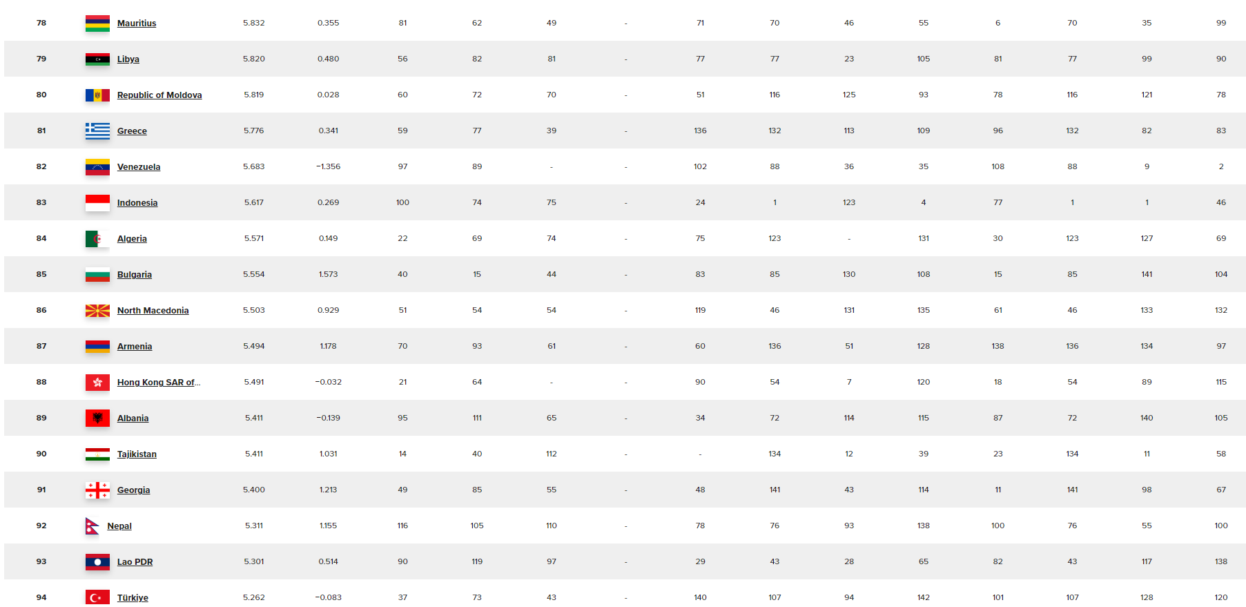 L’Algérie occupe la 84è place de ce classement mondial et la 3è en Afrique derrière l’Île Maurice (78e) et la Libye (79e).