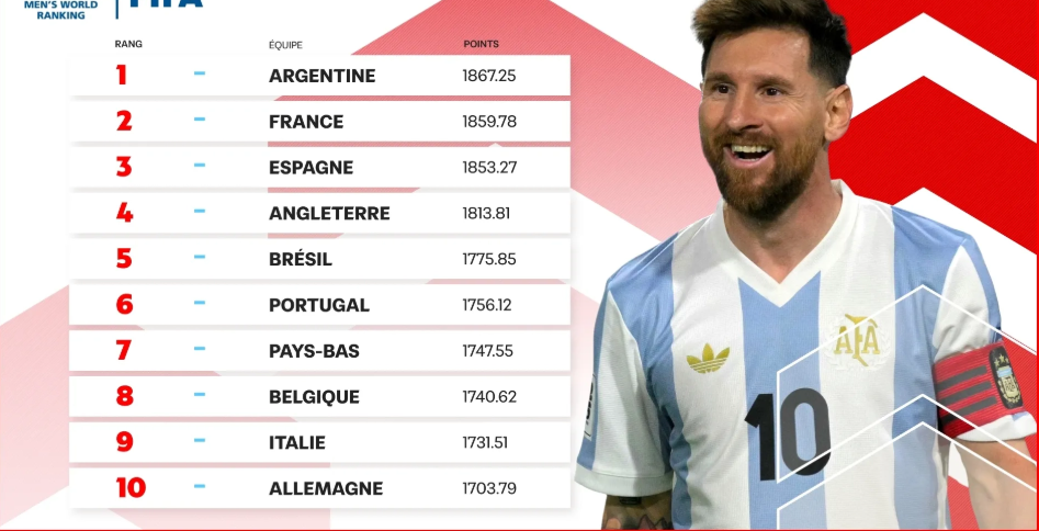 Par ailleurs, l’Argentine reste sur le Toit du monde, devant la France (2e), l’Espagne (3e), l’Angleterre (4e), le Brésil (5), le Portugal (6e), les Pays-Bas (7e), la Belgique (8e), l’Italie (9e) et l’Allemagne (10e).