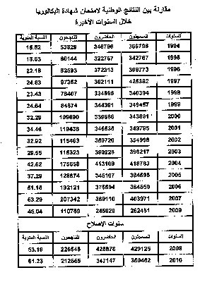 Le taux de réussite au baccalauréat à l’échelle nationale a enregistré un saut qualitatif depuis l’année 1998, c'est-à-dire depuis 12 ans. En effet, le taux le plus élevé a été réalisé par la wilaya de Mascara en 1998 avec 37.47%, pour passer en 2010 à 79.41%, un taux enregistré par la wilaya de Tizi-Ouzou, pendant que de nombreuses wilayas de l’intérieur et du sud sont restées toujours à l’arrière du peloton en termes de taux de réussite enregistrés chaque année.
