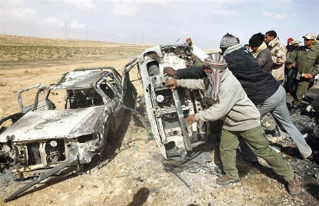 Moustapha Gheriani, un porte-parole du Conseil national de transition (CNT), organe représentatif des rebelles, s’est également montré très prudent, soulignant qu’il n’avait « pas de confirmation » que les 13 victimes aient été tuées par une frappe aérienne. « Des dommages collatéraux sont possibles », a-t-il souligné devant des journalistes à Benghazi. « Nous sommes prêts à les accepter. C’est une guerre. Nous regrettons qu’il puisse y avoir des morts ». A Bruxelles, un responsable de l’Otan a expliqué que l’Alliance devait vérifier « s’il y avait des avions de l’Otan à cet endroit à ce moment-là ». La frappe est survenue sur la route entre Brega et Ajdabiya, peu avant ou après une autre attaque aérienne contre un convoi de l’armée loyaliste qui a provoqué la mort de sept soldats de l’armée libyenne et détruit une dizaine de véhicules sur la même route. La région de Brega est le théâtre depuis trois jours de violents combats entre les forces fidèles au colonel Kadhafi et les insurgés.
