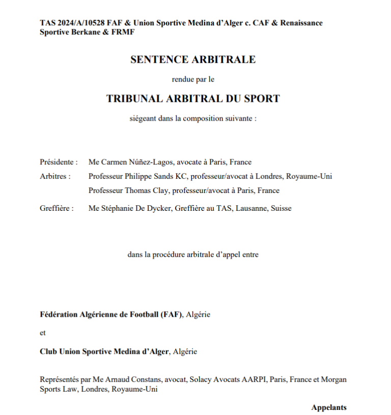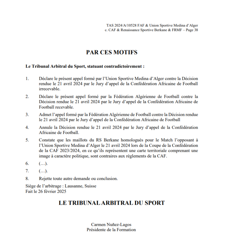 Le Tribunal arbitral du sport (TAS) a publié, ce samedi 15 mars 2025, sa sentence arbitrale concernant le match USMA –RS Berkane en Coupe de la Confédération que le représentant algérien ait décidé de ne pas jouer car maillot de Berkane comprend une carte géographique incluant les territoires sahraouis occupés.