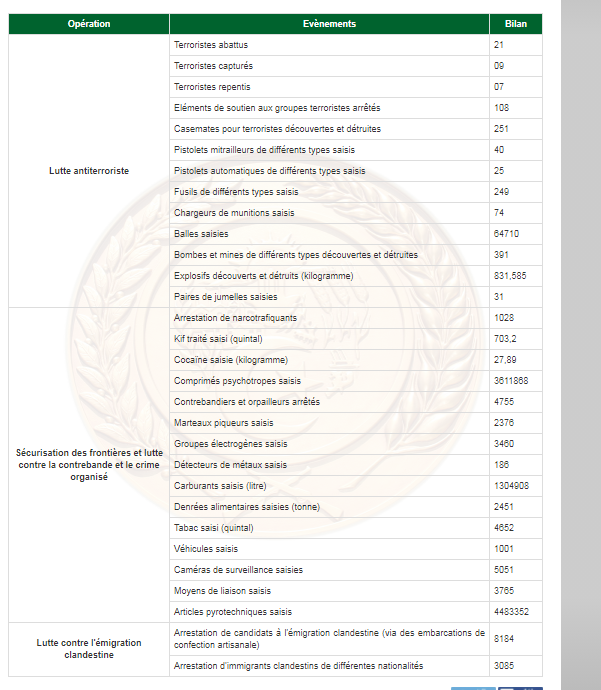 « Conformément aux instructions du Haut Commandement de l’Armée Nationale Populaire, visant le renforcement des efforts et la vigilance afin de préserver la disponibilité opérationnelle à son plus haut niveau, pour faire face à toute éventuelle menace visant la sécurité et la stabilité du pays. L’année 2020 s’est distinguée par de grands résultats, en matière de lutte antiterroriste, contre la contrebande, le trafic d’armes, le narcotrafic et la criminalité organisée, et ce, par la neutralisation et l’arrestation d’un nombre important de terroristes, le démantèlement de plusieurs réseaux de soutien et la destruction d’un grand nombre de casemates et d’abris servant de refuges aux groupes terroristes, comme le confirment les résultats suivants: