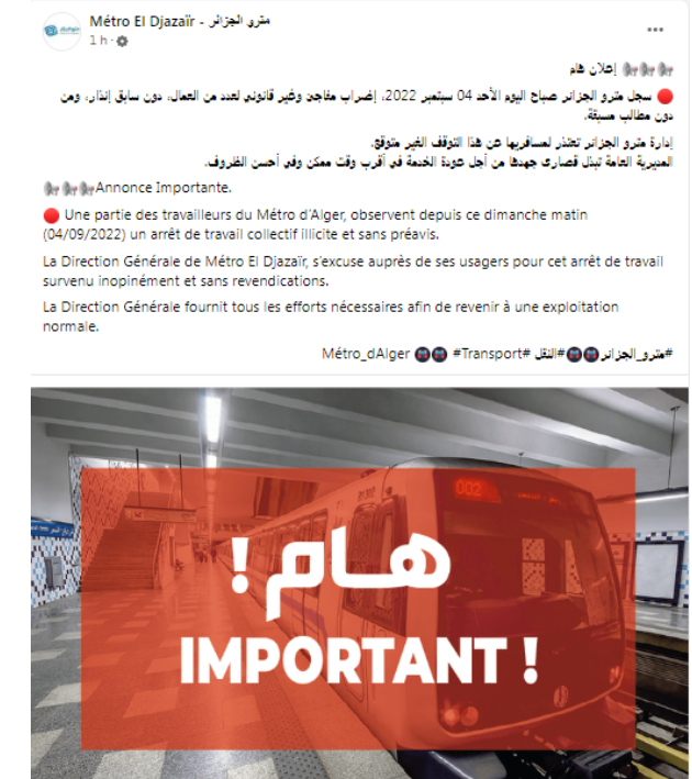 « Une partie des travailleurs du Métro d’Alger, observent depuis ce dimanche matin (04/09/2022) un arrêt de travail collectif illicite et sans préavis », affirme la même entreprise lors d’une annonce sur leur page Facebook.
