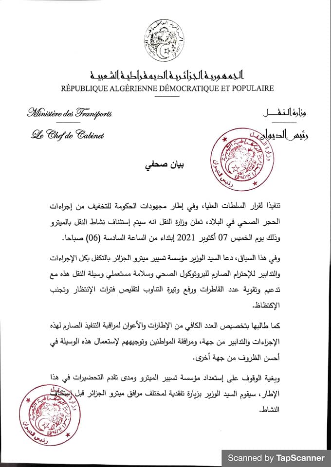“Parallèlement a la reprise du service du métro d’Alger prévue ce jeudi 7 octobre, la Direction générale de la Sûreté nationale (DGSN) accompagnera cette opération par la mise en place d’un plan sécuritaire en vue de protéger le métro et assurer la sécurité de ses usagers”, a indiqué la DGSN dans un communiqué.