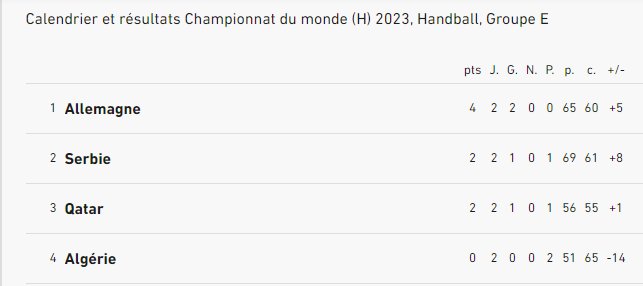 Cette défaite est la deuxième pour le sept algérien après celle concédée vendredi devant la Serbie (36-27). Dans la première rencontre de la poule E, disputée plus tôt, l’Allemagne a battu la Serbie (34-33). A l’issue de cette journée, l’Allemagne occupe la tête du groupe (E) avec un total de 4 points, devant respectivement la Serbie et le Qatar (2 pts) alors que l’Algérie est 4e avec 0 point.