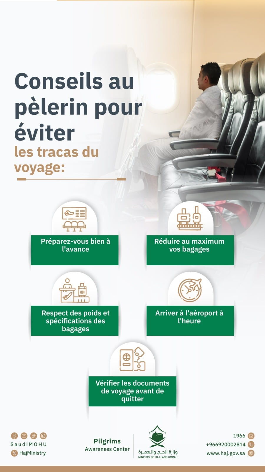 Pour éviter les tracas du voyage et les difficultés lors d’accomplissement du rite du Hajj, le ministère saoudien a exhorté les pèlerins à “se préparer bien avant le voyage, réduire les bagages autant que possible, ne pas dépasser le poids autorisé, à respecter les spécifications des bagages et d’arriver à l’aéroport dans les heures prévues à l’avance et vérifier les documents de voyage avant de se rendre à l’aéroport”.