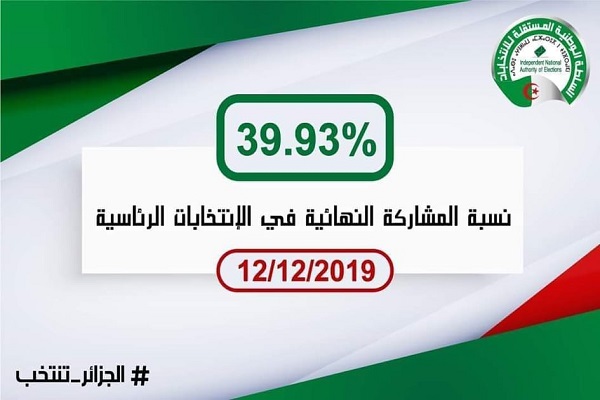 Le taux final de participation global à l’élection présidentielle du 12 décembre a été de 39,93%, a indiqué dans la nuit de jeudi à vendredi le président de l’Autorité nationale indépendante des élections (ANIE), Mohamed Charfi.