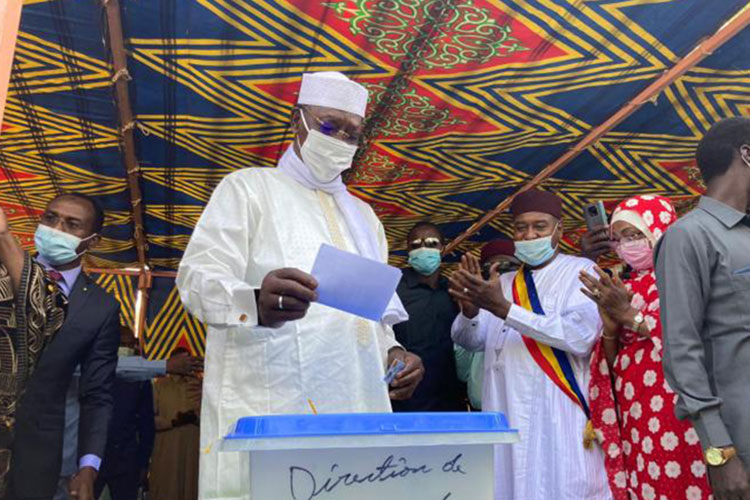 Le président tchadien Idriss Déby Itno en train de voter a N'jamena, le 11 avril 2021.
