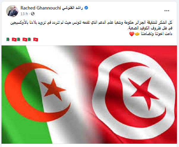 C’est lors d’un post récemment publié sur sa page facebook, qu’El Ghannouchi ait remercié l’Algérie gouvernement et peuple pour son soutien en cette période difficile.