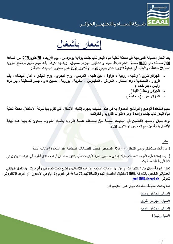 En outre, on retrouve 21 communes qui seront touchées dans diverses régions de la capitale. Elles seront principalement localisées sur la côte Est, mais pas que. Par conséquent, d’après le communiqué, il s’agit de : Reghaia, Rouiba, Heraoua, Ain Taya, El Marsa, Bordj El Bahri, Bordj El Kiffan, Dar El Beida, Bab Ezzouar et Mohammadia.