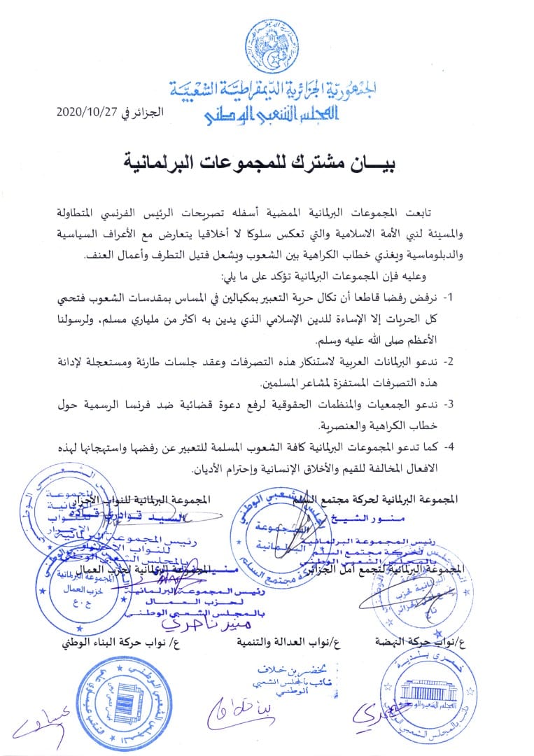 Les groupes signataires de ce communiqué sont le MSP, le FJD, le Mouvement Ennahdha, le PT, Les Indépendants, El Bina et TAJ.