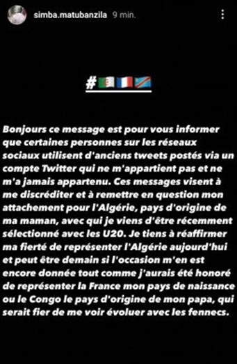 «La Fédération algérienne de football apporte son soutien indéfectible a son international des U20 Simba MATUBANZILA qui a fait l’objet d’attaques vils sur les réseaux sociaux pour avoir choisi de défendre le maillot de l’équipe nationale », affirme la même source dans un communiqué rendu public sur site internet