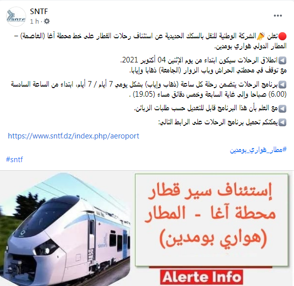 La Société nationale de transport ferroviaire (SNTF) a annoncé la reprise de la ligne ferroviaire “Gare Agha – Aéroport international Houari Boumediène” a compter de ce lundi 4 octobre 2021.