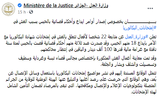 Le ministère de la Justice a annoncé, mardi, dans un communiqué que 22 individus étaient poursuivis en justice pour triche aux épreuves du BAC avec mandat de dépôt pour 18 d’entre eux.
