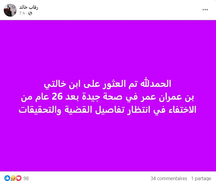Selon des pages facebook locales, le jeune Benamrane Omar a été retrouvé sain et sauf dans une sorte de trou recouvert de foin chez son voisin après avoir été kidnappé en 1996, à l’âge de 16 ans.