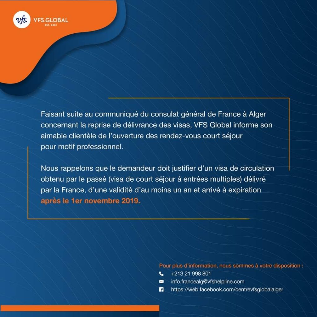 «Faisant suite au communiqué du consulat général de France a Alger concernant la reprise de délivrance des visas, VFS Global informe son aimable clientèle de l’ouverture des rendez-vous court séjour pour motif professionnel », a annoncé, ce jeudi 10 juin 2021, dans un communiqué publié sur sa page Facebook.