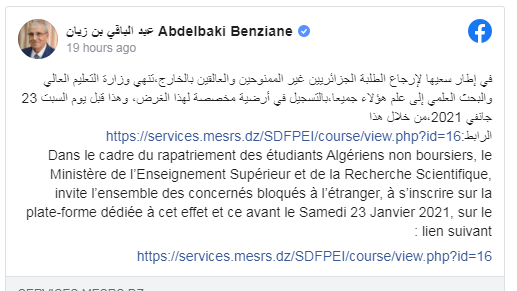« Dans le cadre du rapatriement des étudiants Algériens non boursiers, le ministère de l’Enseignement Supérieur et de la recherche scientifique, invite l’ensemble des concernés bloqués à l’étranger, à s’inscrire sur la plate-forme dédiée à cet effet et ce avant le Samedi 23 Janvier 2021, sur le lien suivant : https://services.mesrs.dz/SDFPEI/course/view.php?id=16 », a écrit le ministre sur sa page Facebook officielle.