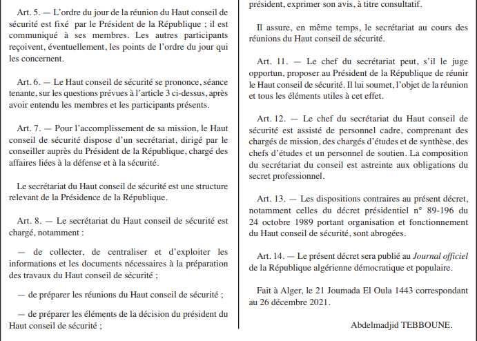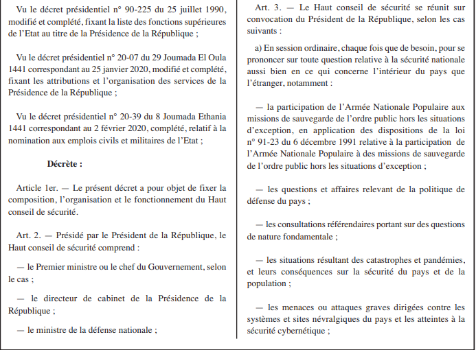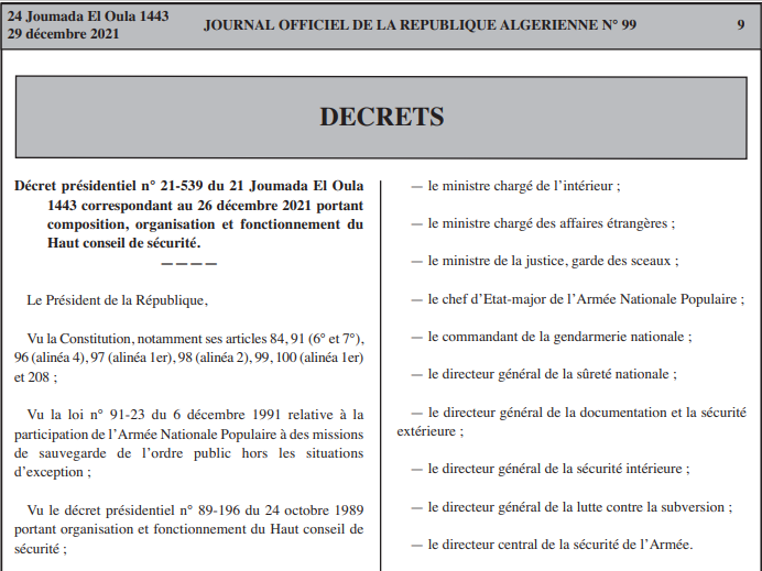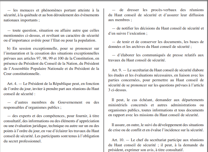 Le décret présidentiel portant composition, organisation et fonctionnement du Haut conseil de sécurité est publié dans le 99e numéro du Journal officiel (JO).