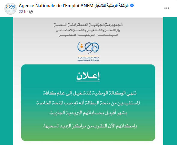 Dans un communiqué publié sur sa page facebook, “l’ANEM a tenu a informer les attributaires de l’allocation chômage que celle-ci ait été versée”.