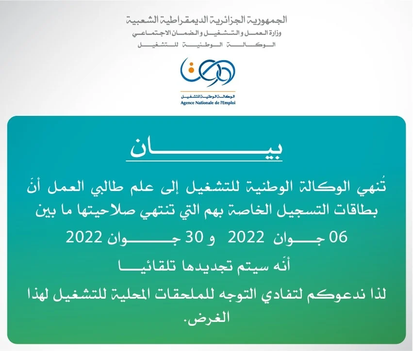 L’Agence nationale de l’emploi (ANEM) a indiqué ,mardi dans un communiqué, que les cartes des demandeurs d’emploi inscrits au fichier de l’agence seront automatiquement renouvelées lorsque leur date d’expiration arrive a terme.