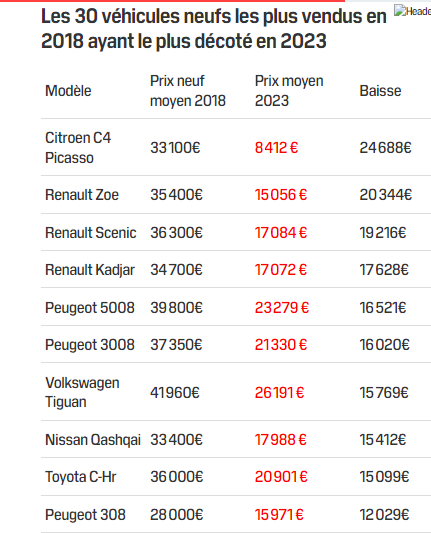 Le site, aux 12 millions de visiteurs uniques par mois pour la partie voiture d’occasion, a ainsi comparé le prix neuf moyen observé en 2018 et celui de 2023. Le classement Leboncoin témoigne d’une décote allant parfois jusqu’à 50% pour certaines marques.