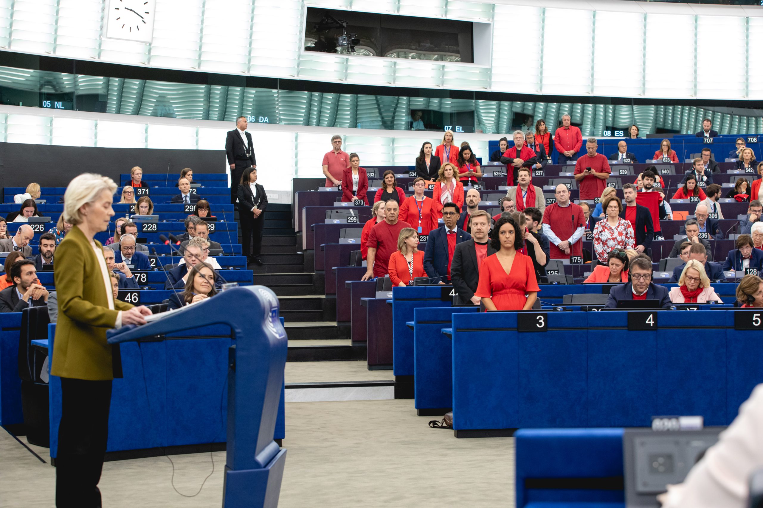 Pour dénoncer le génocide à Gaza et le silence de l’Union européenne, les députés du groupe la Gauche unitaire européenne ont porté des chemises rouges et se sont levés lors du discours sur l’état de l’Union 2025 prononcé par Ursula von der Leyen, le mercredi 10 septembre 2025, au Parlement européen à Strasbourg. Photo : left.eu