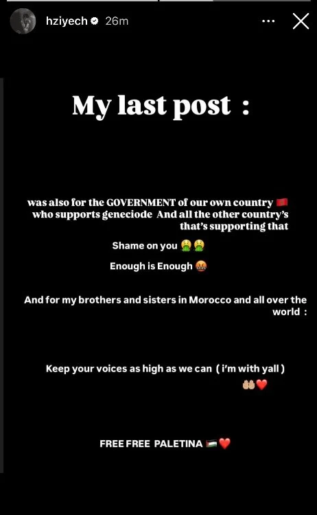 “Ma dernière story vise également le gouvernement de notre pays [le Maroc, ndlr] qui soutient le génocide et tous les autres pays aussi”, a-t-il précisé dans un post sur son compte Instagram.