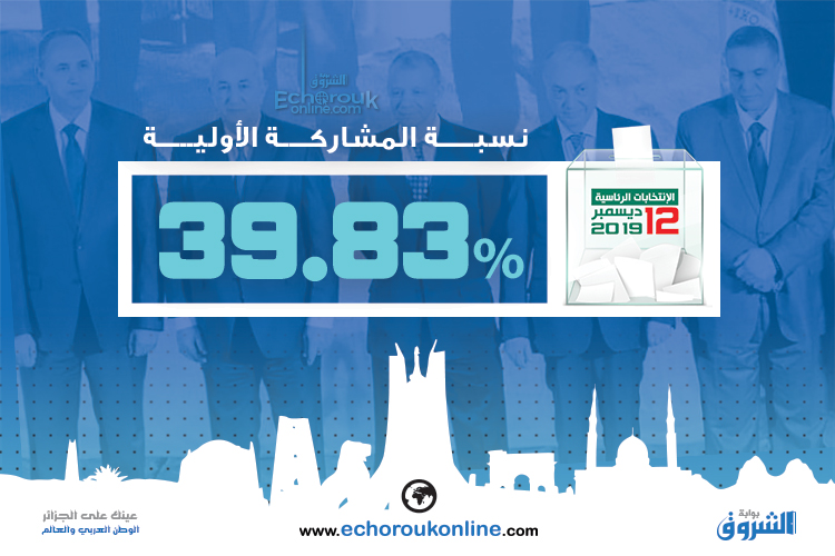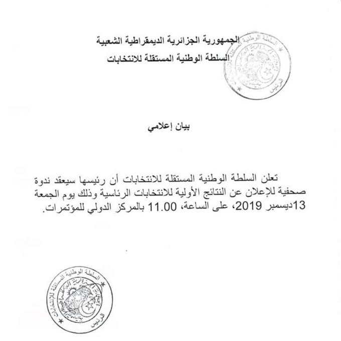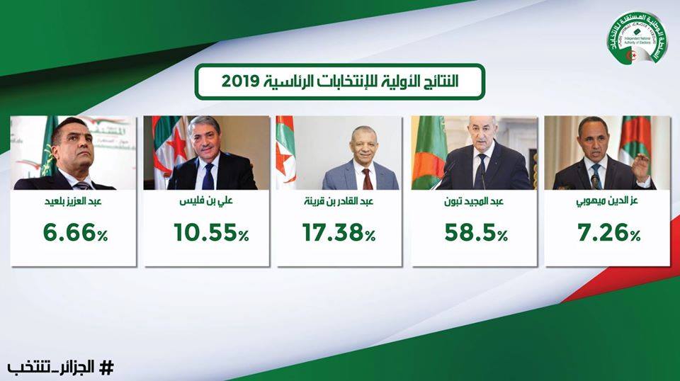21.12: أرقام غير رسمية تتحدث عن حسم عبد المجيد تبون لنتيجة الإنتخابات في دورها الأول، والمترشح عبد القادر بن قرينة في المرتبة الثانية، في انتظار إعلان النتاج الرسمية من طرف السلطة الوطنية للانتخابات غدا الجمعة في ندوة صحافية..
