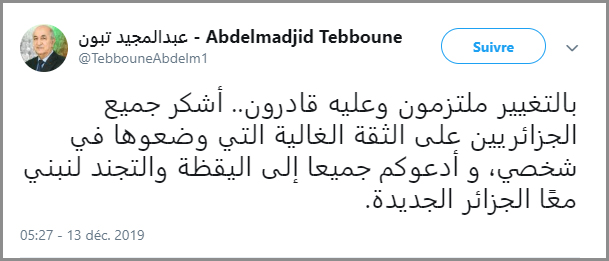 دعا الرئيس الجديد الجزائريين إلى التجند لبناء الجزائر الجديدة، وهذا في أول تغريده له على حسابه في موقع تويتر.