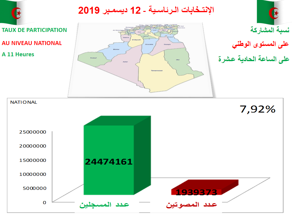 – الولايات التي فاقت نسبة المشاركة فيها 25 بالمائة : ادرار 30.52، الأغواط 29.93، بشار 30.25، تمنراست 29.11، تيارت 25.41، الجلفة 27.05، سعيدة 25.68، بلعباس 27.52، المدية 25.59، معسكر 25.61، ورقلة 25.31، البيض 30.06، اليزي 29.36، تسمسيلت 25.33، النعامة 30.79، عين تيموشنت 25.07، غليزان 26.78