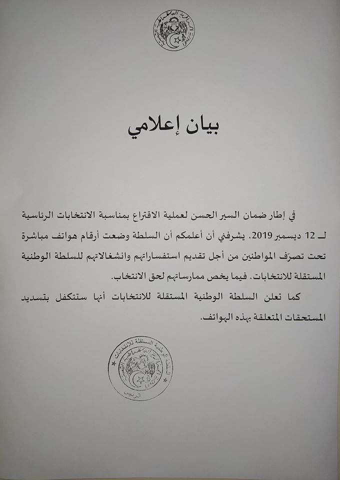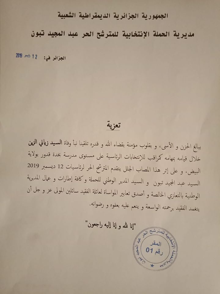 – احترامي وتقديري الخالصين لرئيس الدولة عبد القادر بن صالح لما تعرض له من تجريح ورئيس سلطة الانتخابات واعضائها والتي في ظرف وجيز جسدت وجودها لانتخابات نزيهة..