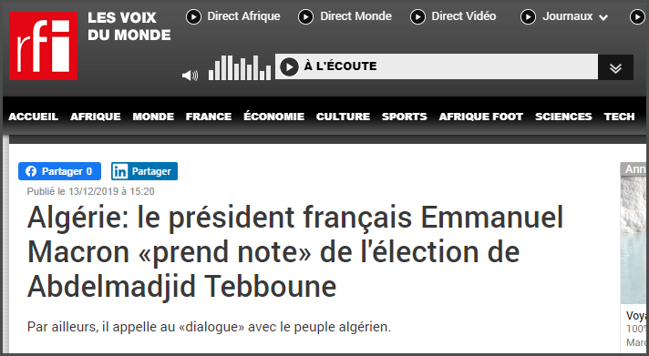 قالت وسائل إعلام فرنسية أن الرئيس الفرنسي إيمانويل ماكرون أحيط علما بانتخاب عبد المجيد تبون رئيسا للجزائر، وقالت أنه يدعو إلى “الحوار مع الشعب الجزائري”..