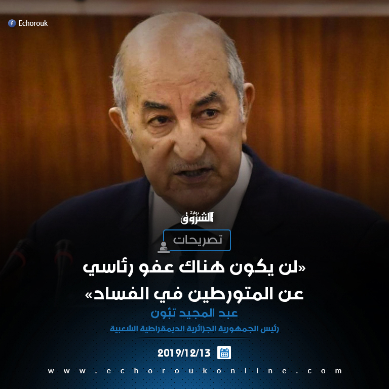 18.53: عاجل | عبد المجيد تبون: لن يكون هناك عفو رئاسي عن المتورطين في الفساد.. وخطتي لاسترجاع الأموال المنهوبة لن أكشف عنها الآن..