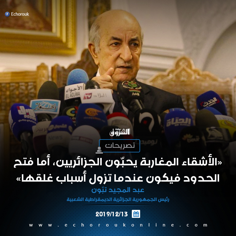 19.10: عبد المجيد تبون: الأشقاء المغاربة يحبون الجزائريين، ولكن فيه ظروف معينة أدت إلى غلق الحدود ولا تزول العلة إلا بزوال أسباب العلة..