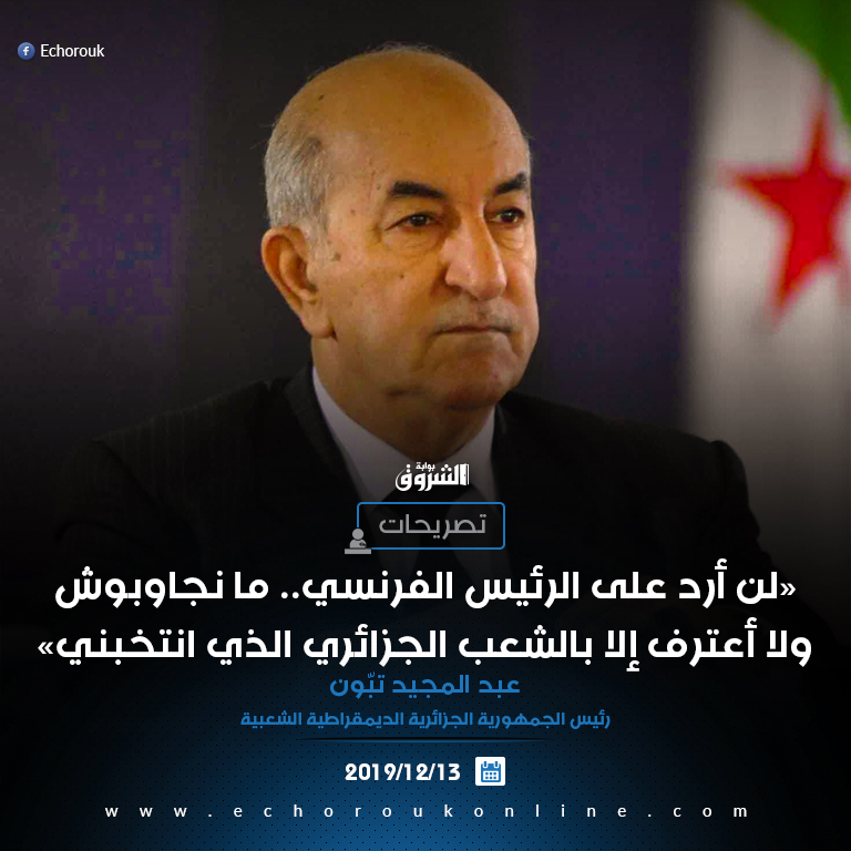 18.45: عاجل | عبد المجيد تبون: أرفض الرد على الرئيس الفرنسي “مانجاوبوش”.. لكن هو حر يسوق للبضاعة التي يشاء في بلاده، وأنا انتخبني الشعب الجزائري ولا أعترف إلا بالشعب الجزائري..