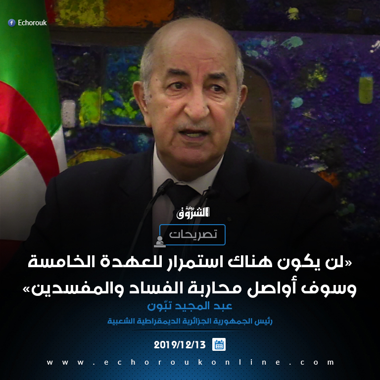 18.42: عاجل | – أول قرار سيكون تغيير عميق للدستور لكي نمضي في التغيير الذي وعدت به الجزائريين، وسوف ادعو قريبا جميع المختصين للمشاركة لإي إثراء الدستور، وبعد تجهيز المسودة، ستطرح للنقاش في الداخل والخارج، ثم يطرح لاستفتاء شعبي، وبعدها سنكون فعلا دخلنا في جمهورية جديدة.